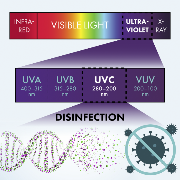 UV-C light is proven to kill 99.9% of germs on the molecular level by destroying the DNA of germs